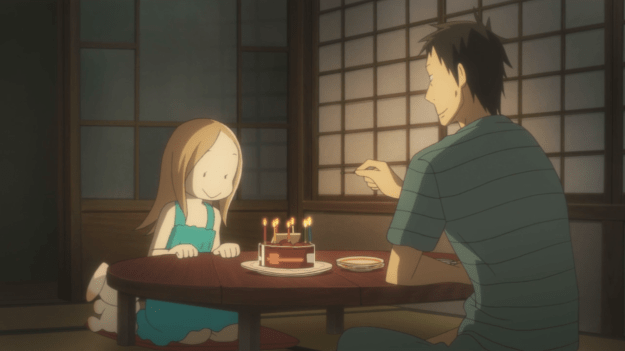 So we know this can’t happen because the story’s all about Rin and Daikichi. Any story featuring Masako is thus a dead end for the time being and Usagi Drop’s eighth episode hammers home this very point. Masako comes close enough to observe Rin from a distance, but this is as far as she’ll go. She acknowledges that it’s her daughter’s birthday, but she has no letter, card, or present for Rin. Yes, it’s very much understandable that Masako might want Rin to never learn of her mother’s existence, but Masako could have gotten a gift for her daughter anyway. All she would have to do is ask Daikichi to claim her present as his. Instead, what do we see?