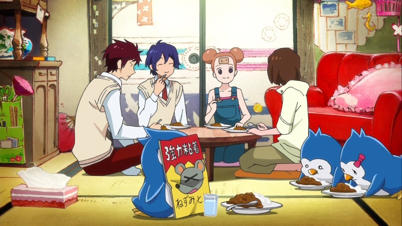 What becomes quite apparent from all of these screenshots is that young people in Mawaru Penguindrum consume a lot of food. These characters derive a lot of their pleasure from the act of eating. Even if the two brothers are too busy to partake in a meal, i.e. they’re in the middle of a mission, their penguins can afford to eat. In fact, the penguins’ appetites are absolutely voracious. Since one can reasonably imagine that the penguins are extensions of the brothers themselves, one can also reasonably assume that the brothers have voracious appetites for food as well.