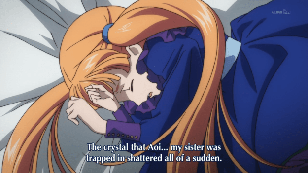 Guys, this is the definition of contrived storytelling. This is when writers don’t allow their characters to evolve organically. Instead, we have a checklist of how a story must unfold, and goddamn, we’ll force a square peg into a round hole if we have to. Ruri can’t just be sad that her parents are gone and her sister’s trapped in a crystal. Ruri has to forever rue the day she uttered those bitter words to her sister! Anyway, someone thought it would actually be a good idea to have a young Ruri cry as she tries to mold yet another clay angel. I mean, did the writers honestly think this scene wouldn’t have been funny-looking?