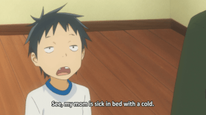 Daikichi’s wish that he could have fallen sick in Rin’s place did feel a bit manipulative to me. It brings to mind the pattern of “Why, God, why? She was too good / young / kind to die! Why couldn’t I have died in her place!” which already strikes me as manipulative. When we have the same thing applied to a cold it feels silly. Apparently my family didn’t treat colds with the seriousness they deserve though- 24/7 bed rest, monitoring minute changes in temperature, sleeping within arms-reach, and spoon-feeding.