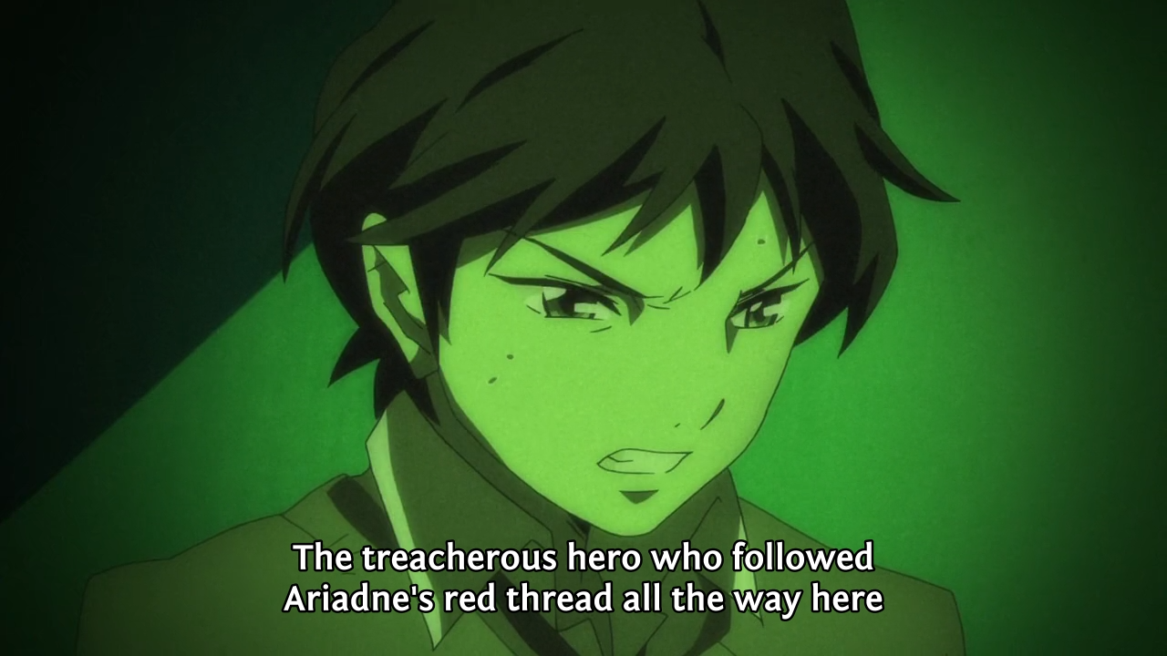 • When Kanba finally discovers where his brother is held, Masako alludes to herself as Ariadne and Kanba’s sweater as Ariadne’s red thread. For those unfamiliar with Greek mythology, Ariadne gave Theseus a ball of yarn to help him escape a labyrinth. She also fell in love with the hero only for him to ditch her after he had escaped. In a way, Masako helps Kanba navigate the labyrinth of his own mind to not only save his brother but to also recall previously forgotten memories.