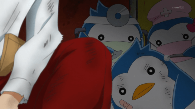 So what does this all mean? So the penguins are cartoonish and childish — aren’t they cartoon characters to begin with? Aren’t they obviously childish because they are animals and most animals are not complex thinking creatures? It is apparent that the penguins seem to perform actions that their owners might want to do, but, for whatever reason, they cannot. Somewhere in the back of his mind, Kanba might want to steal panties and look up girls’ skirts, but he can’t for a plethora of reasons. As a result, #1 will do it for him. The penguins lack a voice, but what does the silence really entail? The crucial difference between the penguins and their owners is guilt.