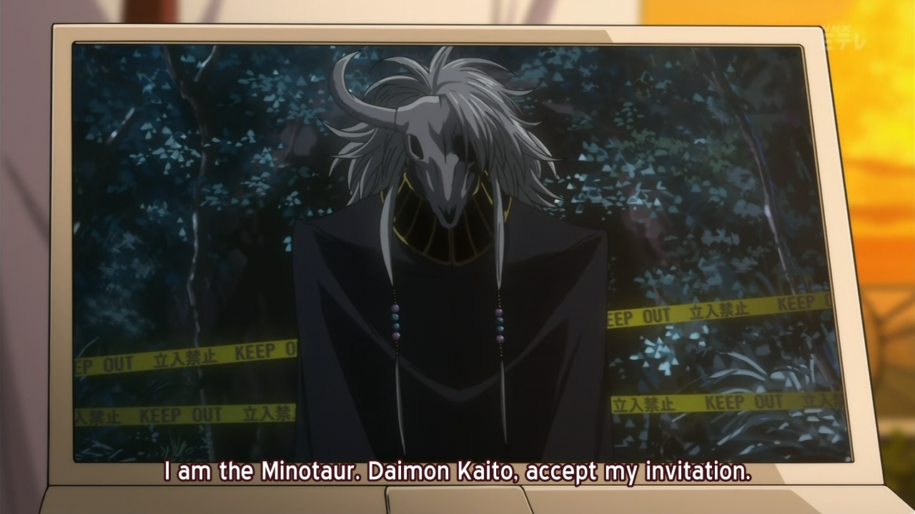 With that said, Phi Brain sort of reminds me of Liar Game, a manga series most recently known for its live drama adaptation. Both stories feature a moody, rebellious guy who is insanely good at problem-solving and both stories feature a slightly naive girl. Hell, both stories even trick their main characters into signing a contract to play a deadly game. The live drama version of Liar Game blatantly rips off the puppet from Saw while Phi Brain has some cloaked dude wearing a steer’s skull — how satanic and sinister. I love how he still has flowing anime hair though.