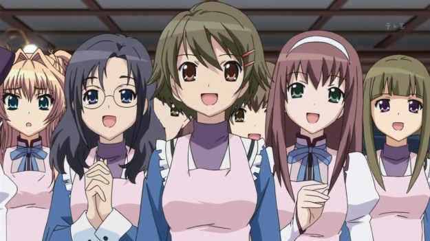 I mean, I never expect these harem series to be any good, but I do expect them to have a little more energy. Mashiro-Iro Symphony is, however, strangely lifeless and slow-paced. Uguu-kun is honestly proud that he can peel chestnuts and wash rice. So then he takes a moment to survey the peaceful classroom as if to pat himself on the back for a job well done. It’s almost as if the anime wants to be contemplative about its Stranger in a Strangeland scenario without understanding that it’s a goddamn harem. Meanwhile, where’s the witty banter? Where’s the comedy? But by comedy, I don’t mean stock harem hijinks.