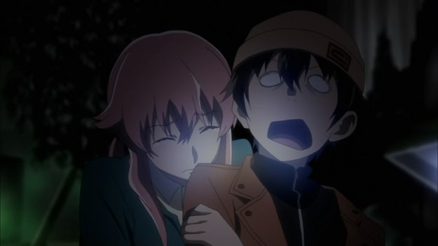 I’m not going to pretend that I’m a Yuno convert. Compared to most anime with their blushing, doting maidens, it was certainly a billion times more interesting to watch a crazy girl stalk some dorky introvert. Having said that, however, I still don’t think Yuno’s an awesome character that I’d root for or anything. At this point, I’m just hoping for a School Days-esque finish for our couple. I don’t know what breaking the “causality continuum” means, but hey, maybe one of the dead bodies in Yuno’s strange room is Yuki! In any case, this would certainly be paradoxical. Here’s to hoping.
