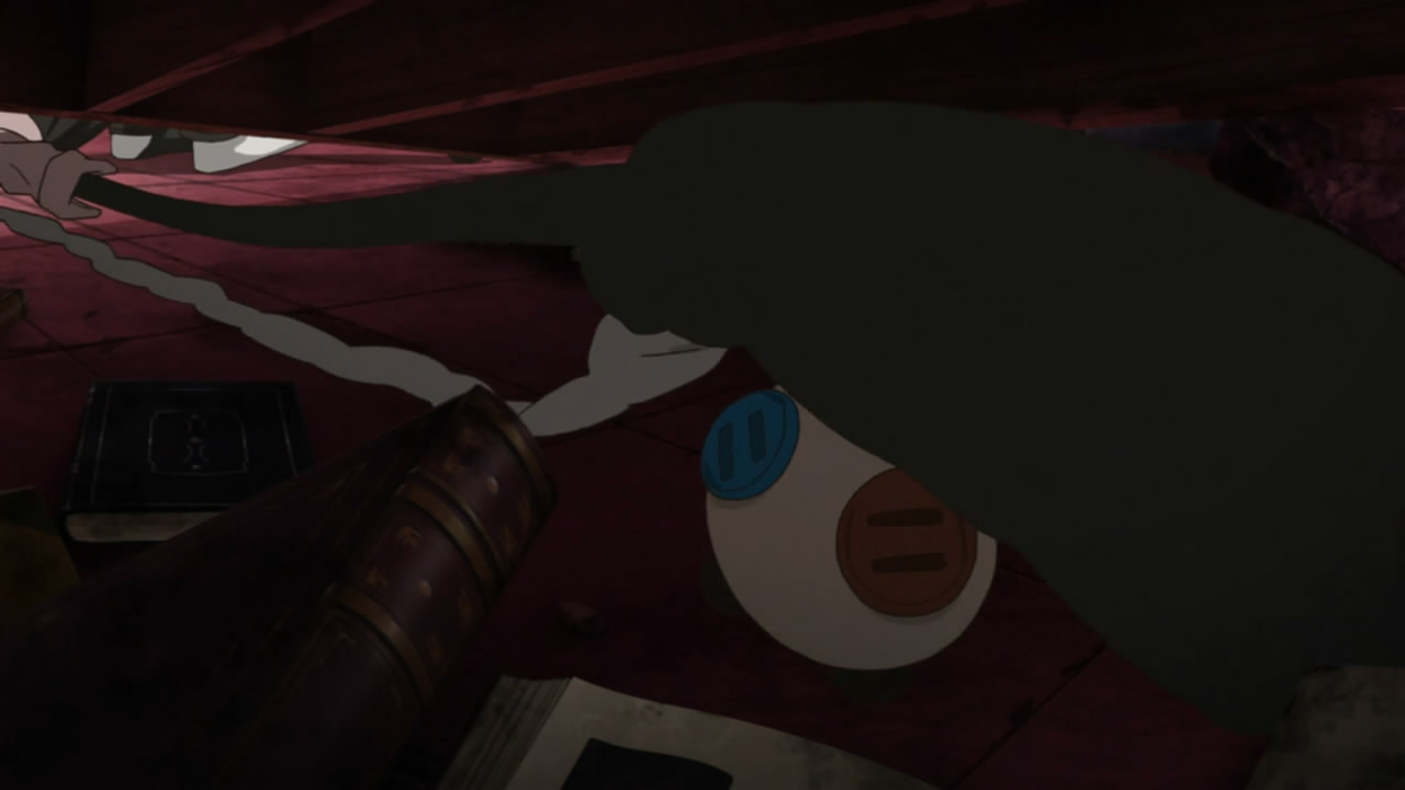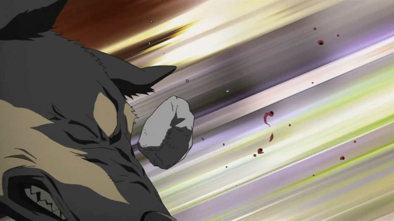 I think the dog was meant to be dangerous (rabid?) although the animation didn’t look particular scary apart from some growling… Therefore I figure the scene was either part of the world-building – to show that it’s a cruel world where pragmatic violence is the norm, or it’s simply a left-over from the original novel which was written back when violence against animals wasn’t considered a bad thing.
