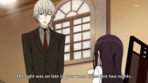 But Soushi redefines the word ‘sycophant.’ His actions border on the pathologic that I don’t think the romantic ideals of the olden days ever espoused. Did lords ever stalk their ladies day and night like some bizarre, twisted creature of the night… like… some Mormon vampire, you might even say. Soushi croons that it hurts just to even spend one living second away from his ojousama. He watches her every move so that he may serve her every need. Well, even before Bella ever learned of Edward’s existence, he had already been studying her: