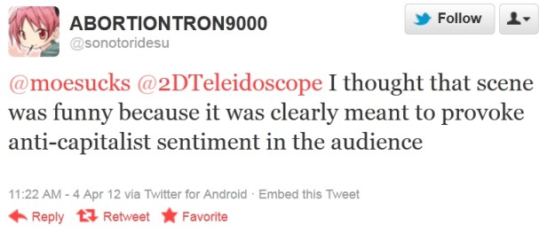 It is nice to see an attempt at social commentary in anime though. It’s very rare to see a show involving the poor. From watching anime, all of Japan is comfortably middle class and there are no homeless… Apparently, this isn’t just in anime, but many Japanese people actually believe this, despite one in six people living below the poverty line: http://www.nytimes.com/2010/04/22/world/asia/22poverty.html