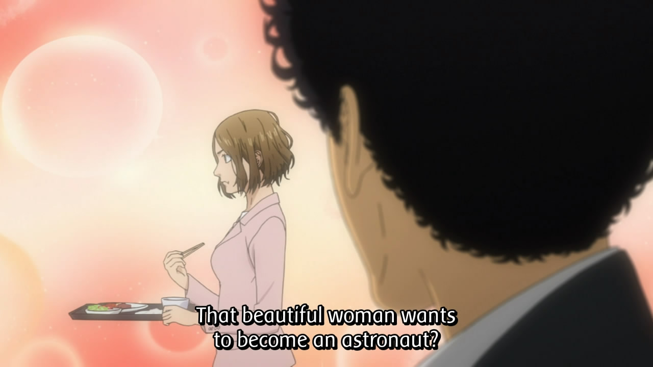 • Throughout the entire auditioning process, we don’t see a single women. It’s not until Mutta sits down at the cafeteria that the anime finally introduces us to a female character at JAXA. Having said that, I’m not really harping about the lack of gender equality in the tryout scenes. I don’t really know how the real JAXA operates. Maybe there really isn’t any woman in the organization (though that’s hard to believe, but even if this was true, there’s no reason the anime needs to be as realistic as possible on this particular subject matter).