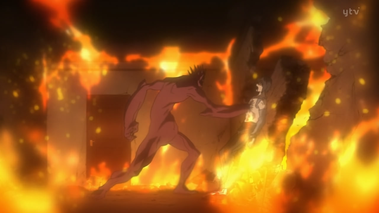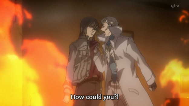 There is, however, a more meaningful contrast between the two (former?) friends. We saw this last week when Kouga scolded Jin for helping people for monetary gain. Kouga believes in justice or so he claims. He goes after this week’s arsonist because he wants to “work for justice.” On the other hand, we’re not entirely sure why Jin is also at the scene. Unless I’ve missed something, Jin just kinda shows up and starts fighting.