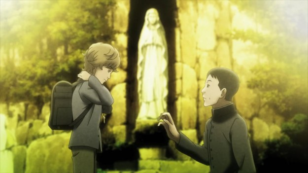 And both guys come from troubled childhoods. Both guys had difficulty making friends. Both guys were abandoned by their fathers. So is this the reason that Sentaro has turned the “father which art in heaven?” Will Kaoru find salvation in the same embrace of the Lord? I’m not a Christian (or remotely religious), but sin and redemption fascinate me. The last time I wrote about Sakamichi no Apollon, I hinted that I would compare the anime to Haibane Renmei. Unfortunately, it’s still a bit too early for that, I think, but I do want to make a quick observation on Sentaro’s behavior.