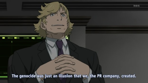 This is me trying to make sense of how AO relates to its predecessor. Bear with me for a moment. I’m sure everyone has discussed this particular subject to death, but until now, I had only managed to watch a single episode of the sequel. I haven’t been reading any blogs either so I don’t have a clue what the popular theories are. So anyway, I was under the impression that AO would be a direct sequel to the original show. After eleven straight episodes of geopolitical drama, however, this is clearly incorrect to some degree: