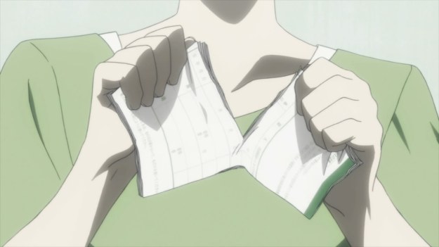 Atsushi remembers Rokka telling him, “So this is what it means to arrange flowers like they’re still flowers.” The emphasis is mine. I believe that this is a telling quote. Tearing up the divorce papers appeared to have been a beautiful gesture of love — a declaration that their marriage will never die. But with him nearing death’s embrace, presumably bedridden and trapped within the confines of a hospital, the act does not and cannot change the fact that their marriage was dead or close to it. Like flowers, she simply “arranged it” so that it would appear as though they were still married.