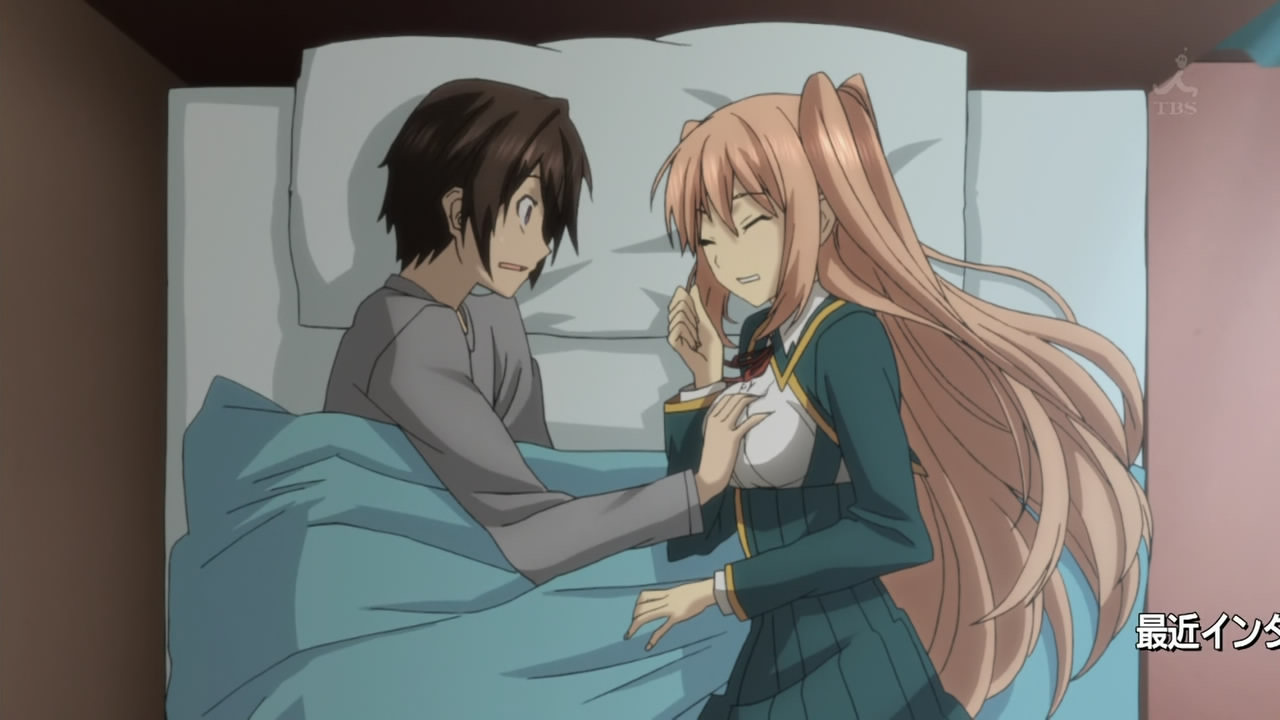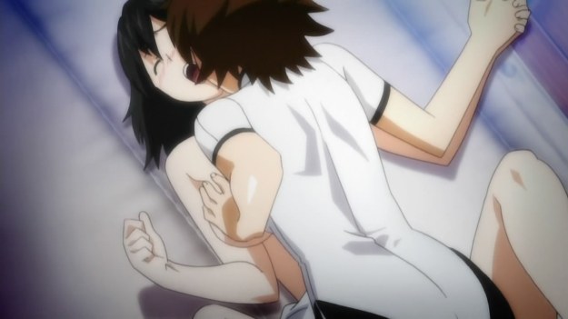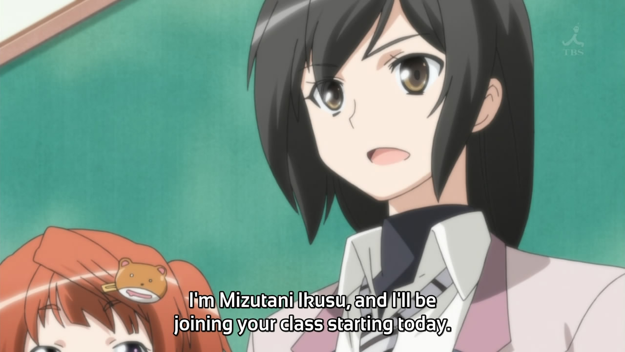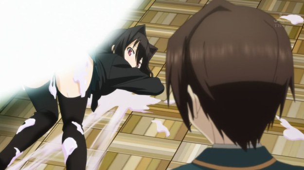 Unfortunately, Imouto fails to capitalize by exploiting the trope where girl get mad and throw objects at the harem lead (150). Not only that, the anime gets all meta and has a student ask why there are always transfer students. The teacher replies, “…I hate kids who mind tiny details like that.” Eesh, cleverness in my generic harem? No thanks (-50).