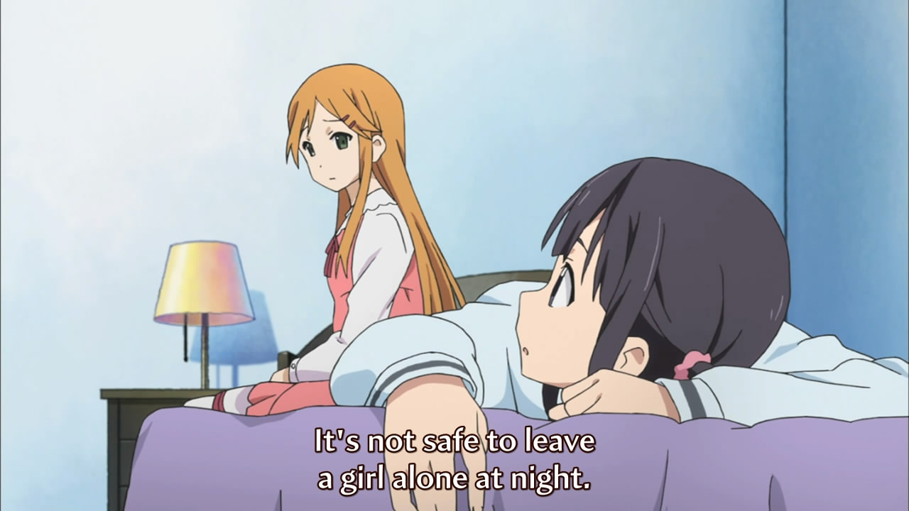 Oh well, maybe it’s just me who finds this topic particularly interesting. Maybe I’m “overanalyzing” it. In any case, I continue to hope that Kokoro Connect will delve more into the friends’ lives like I had written a week ago. Unfortunately, the second episode only gives us a mere teaser. Apparently, Yui and Iori also swapped bodies, prompting the former to ask Iori about her rather empty home life. This particular moment could’ve and should’ve been exploited to greater effect. Instead, the anime opts to express the view that it just isn’t safe to leave a girl alone at home. Oh, okay.