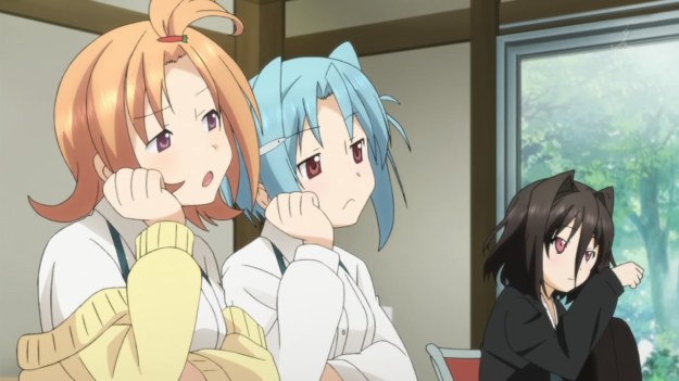 Incestuous and hetero-normative? Damn, just exactly how deep does the rabbitshit hole go? This week’s episode has got to be the most egregious example of homophobia to recently grace anime. For those who haven’t seen the episode, two of the girls are afraid that the rich harem lead might actually be gay. They thus set out to “fix” him by pretending to be his imouto. ‘Cause, y’know, homosexuality is an incorrect choice and you can simply seduce people back to “normality.” I won’t deny that this train wreck makes for one of the more compelling anime this season to watch, but still, this episode was tough to stomach.