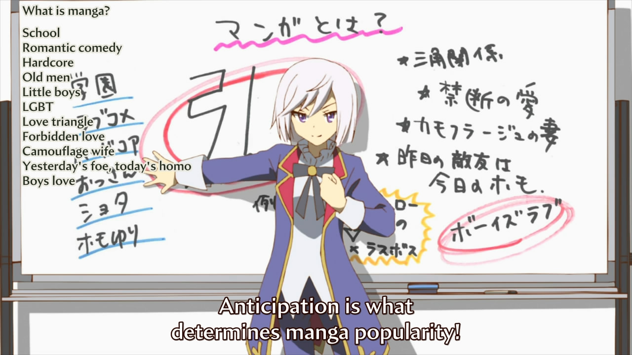 I kept waiting for the episode to deliver the savage blow to manga that it seemed to be building up to, but the moment never materialized. Jinrui wa Suitai Shimashita is just very literal about its observations. Whatever criticism you can currently make about manga, you will see it played out in this week’s episode. Unfortunately, the absurdity or cynicism never ramps up from there. The result is a deconstruction that doesn’t really amount to any satisfying conclusion. The show refuses to offer any additional insight that isn’t already readily apparent to anyone immersed in the animanga subculture. What we have is thus self-referential masturbation: “Look how aware I am about the problems inherent within my subculture!” Yeah, well, what about it? People have been making the same criticisms for a long time now. Jinrui wa Suitai Shimashita lacks that extra step that would make it truly incisive.