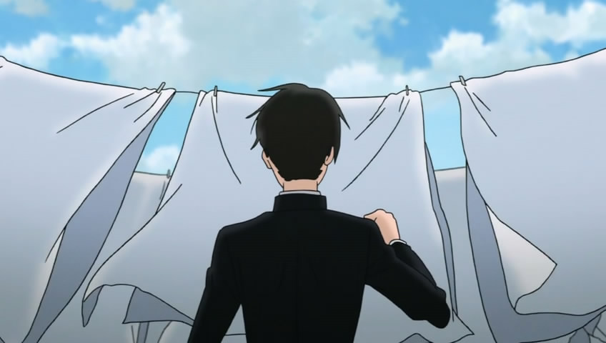 At this point in the anime, Sentarou disappears because, as I’ve said before, he is dead. Not physically dead, but the Sentarou-as-we-know-him is gone. He needs his salvation and, as a result, when we finally see Sentarou again, he has become a man of the cloth, i.e. a clergyman. Aha! We can now see how the hospital sheets from before served as a foreshadowing of his fate. In any case, through Christianity, he can be reborn. In a Christian birth, we are baptized and our sins are washed away. Sentarou commits himself to a religious life in order to assuage his guilt and wash away his sins.