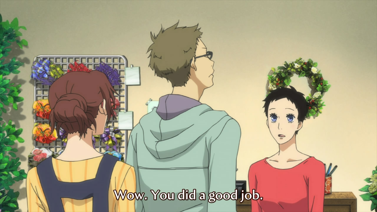 • The anime returns to the real world where Atsushi-as-Hazuki buys a bouquet of tulips from Rokka, then immediately gives it back to her as a gift. Tulips are often seen as a symbol of perfect love. In that sense, then, the scene can be read as an attempt from Atsushi to re-establish that connection of love between him and his wife. Of course, the connection is imperfect: he has to buy the tulips from her. This reflects the fact that she doesn’t recognize Atsushi as Atsushi at all, so she’s not really giving him perfect love. Having said that, it’s not as though we ever see money being exchanged.