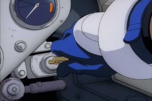 Outlaw Star‘s Gene Starwind is not the type of hero that fades into his uniform when the going gets tough. In fact, he has no uniform; he is uniquely himself. He’s also far removed from the sensitive high school tryhards of our current generation of anime protagonists. Rather, Gene embodies that Other on the fringe of society, eeking out his existence through his own means rather than being subservient to some larger entity. He’s brash, he’s covered in scars, he’s a womanizer and a smooth-talker, he exudes confidence, etc. Most of all, I think he has the sort of individuality that is probably diametrically opposed to someone like the salaryman. He is beholden to nobody but himself and his own values, which is very much unlike a man within a corporate structure. Outlaw Star‘s early episodes can be seen as Gene’s coming-of-age. Like how teens in the West cherish the day they get their first car, Gene’s starship represents his unfettered freedom, the ability to go where ever one pleases. It’s no surprise then that even a spaceship from some undetermined future nevertheless starts up by turning an ignition key, symbolizing a rite of passage analogous to our own personal experiences with cars.