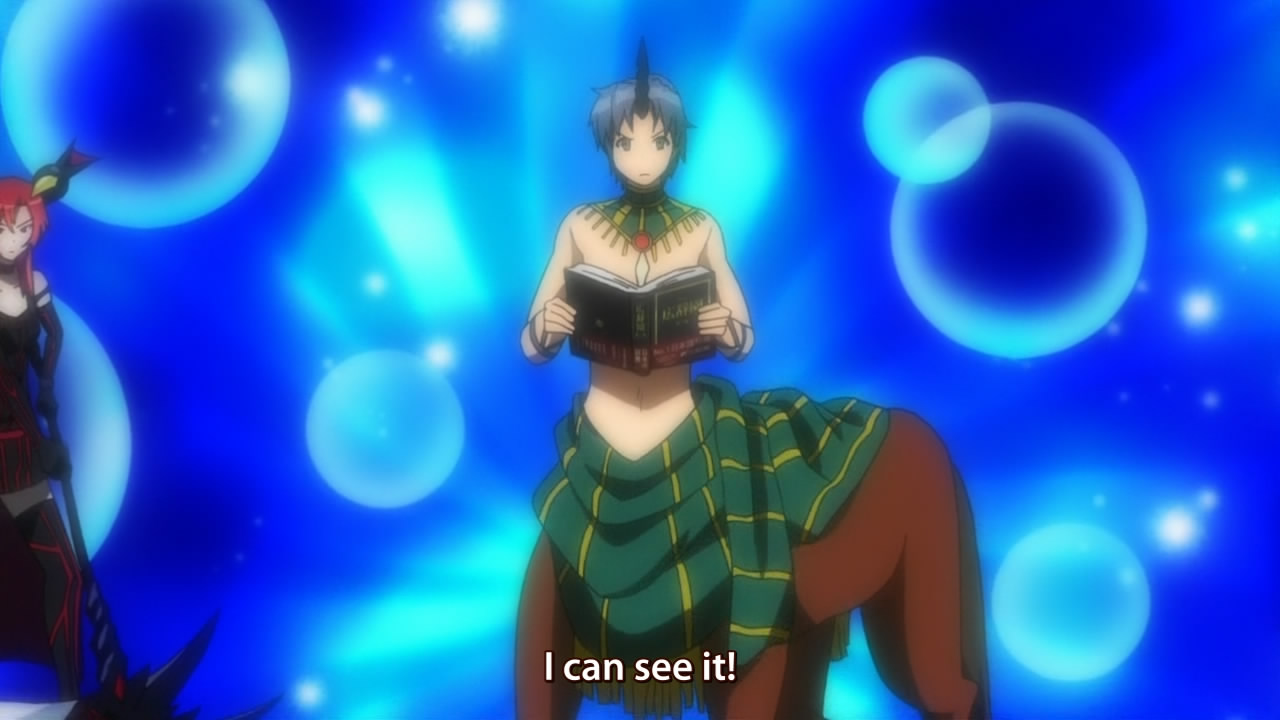 But when Lisara still can’t beat the monster, the anime trots out the cliches: Ryousuke has some legendary sword within him that can destroy the enemy in one hit. Somehow, a mysterious figure is watching the entire thing unfold because magic (100). He also says our favorite anime word: “Omoshiroi” (50).