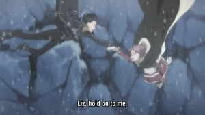 Again, Kirito is the Gary Stu who can do no wrong. If he’s made any mistake this week, it’s that he thought he could run up the ice wall, but y’see, that’s just yet another badass moment. After all, other losers wouldn’t even have the skills or guts to try such a feat! Guess we’ll just have to set up camp. So we’re led to a silly bonding moment where the previously tsuntsun shopkeeper suddenly takes a liking to our black swordsman and his jet black sword (read: dilznick again). Kirito gets to charm us with lines like, “Rather than letting someone die alone, it’s better to die with them together. Especially if that someone is a girl like you.”