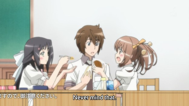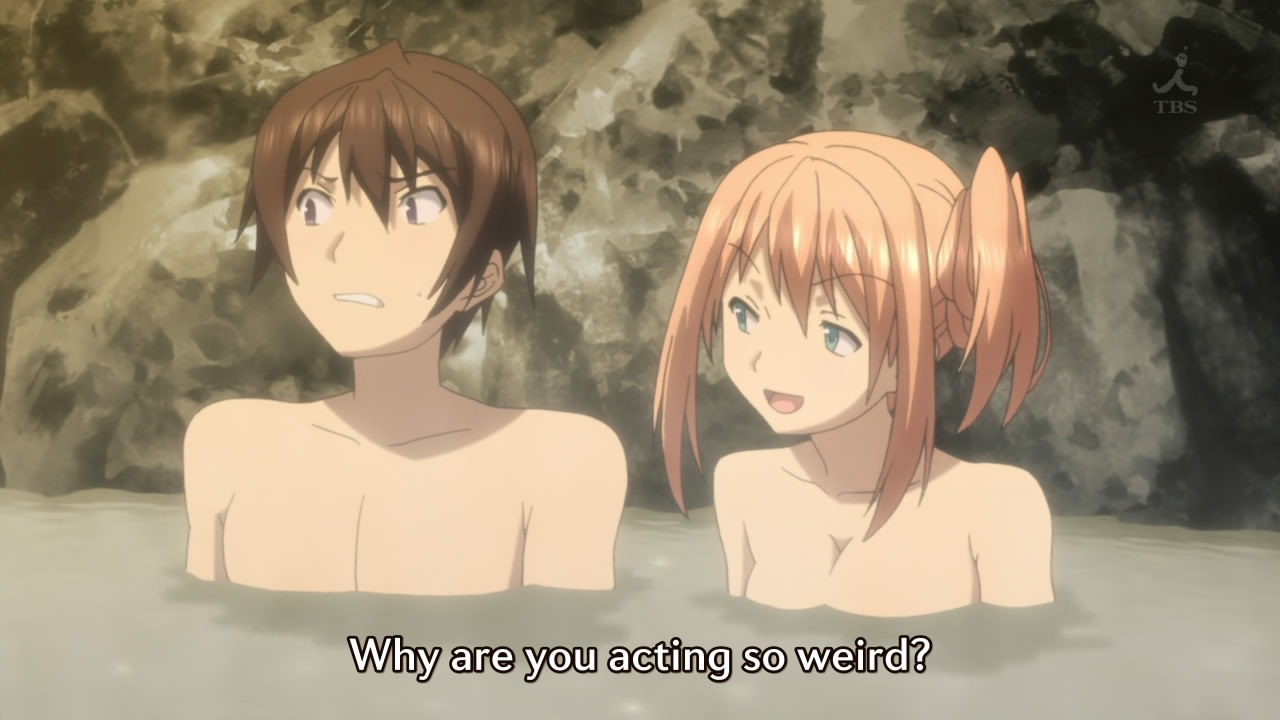 By my math, Campione! ends up losing 100 points for its compatriots. Tsk tsk. You might naturally assume that negative points imply may imply that a harem is the opposite of bad, i.e. good. Well, no. Campione! still sucks on multiple fronts (mediocre animation, boring action, lame characters, etc.), but it’s just not a shitty harem for this very week. Now, speaking of a shitty harem…