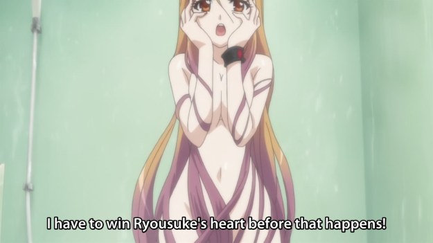 Sure enough, the three saviors get attacked and Ryousuke tries to use his pervert powers to save the day. I’m not sure how many points a shitton of naked asses are worth though. Let’s just say 1000. All of a sudden, however, Dekinai wants to develop its characters, so Ryousuke now conveniently suffers from a lack of confidence. In other words, he can’t get it up (250) even when he’s in a house full of sexy maids (50). So what’s a guy to do? Why, have the sexy maids with weird tongues lick him all over, of course (250)!