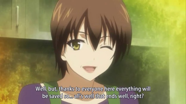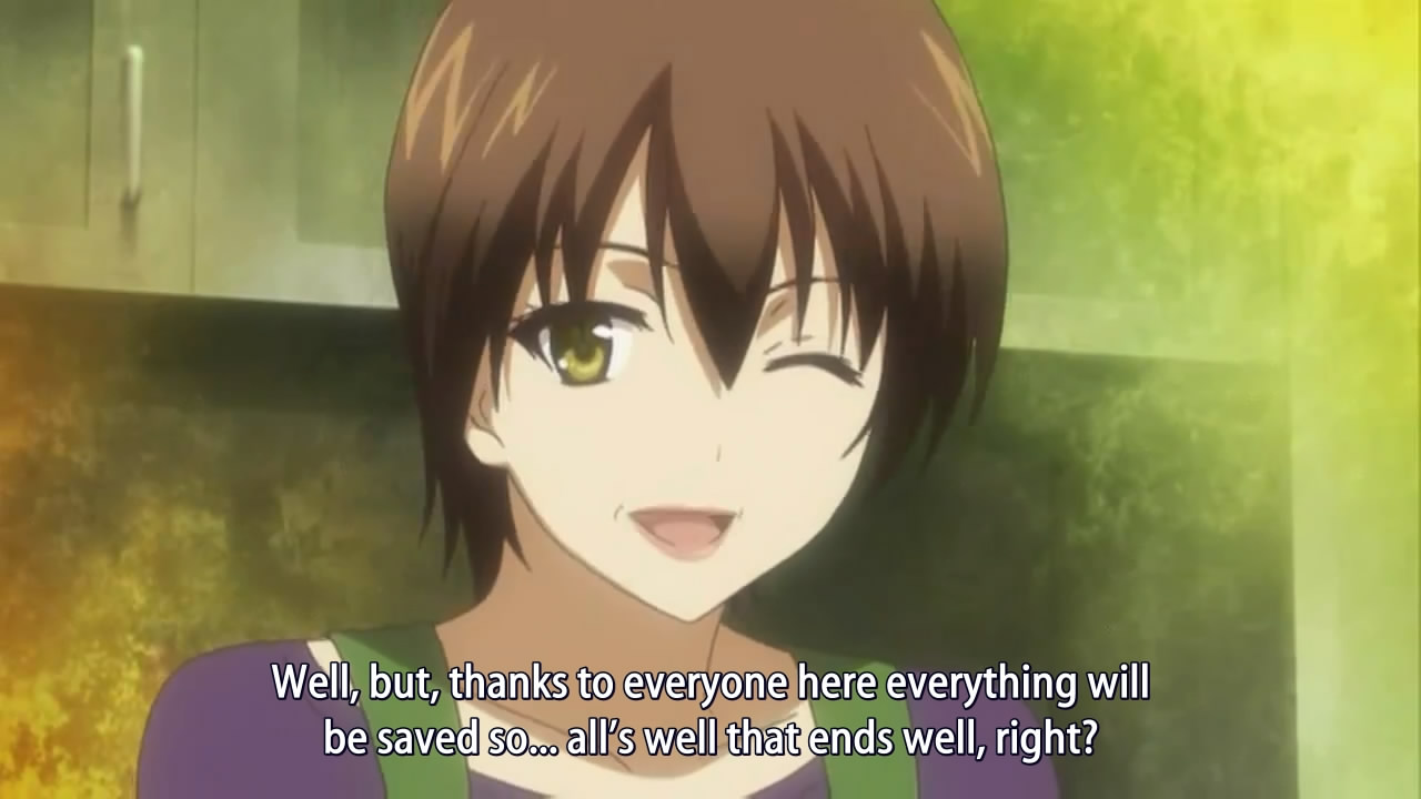The latter half of the series may as well have been some sappy Korean live drama instead. Chisato wants Yuuki to be her replacement brother, but Yuuki is afraid that he’ll be abandoned by her if she gets over her grief, so he abandons her first! Oh the twists and turns! The days of our lives! All of this is framed by a tens of billions of yen conspiracy involving the school, an attempted murder, an operative trapped in a coma, and a dear friend willing to sell out his values in order to save her life~! And this all started because some dork decided to run for student council president just to save his crappy club from being closed.