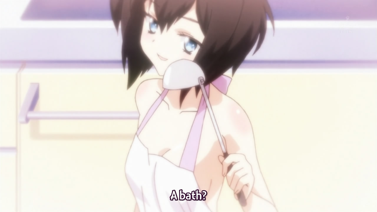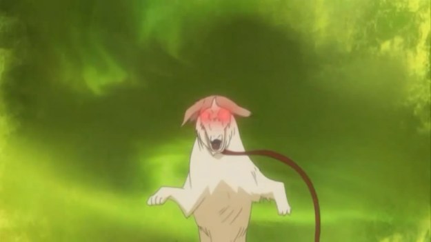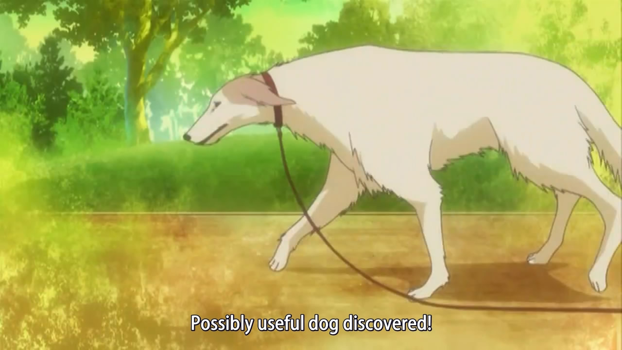 Let’s have fun, Mina says, in our radioactive green world that is pretty much empty of any life except, of course, the most important women in Ryousuke’s life. The harem never dies. The harem is unending. Whoa, wait, I spoke too soon, because out of nowhere, a weirdass-looking dog (what a tiny head):