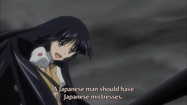 Even better, Erica shows up and tells the other two girls to get out. How do they respond? They simply obey (250). Yeah, yeah, there’s a historical context here in that men have had multiple wives in various Asian cultures. I also don’t give a shit. You’re not going to convince me that this is all cool and dandy in an anime about contemporary characters pretending to fight mythological gods.