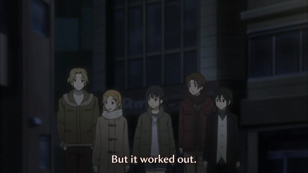 I suppose it’s first necessary to address the content of this “final” episode. Iori’s mom sounds like she’s in trouble, because her second husband is a deadbeat wife-beater. Iori blames herself, but her friends convince her otherwise. So even when Heartseed #1 offers to send Iori back to any point in time in order to fix her domestic situation, she refuses. Heartseed #2, we’re told, “will no longer be able to meddle with [the five friends].” Is this a rush job because of the bullying incident I mentioned above, I can’t really tell. It is a wholly unsatisfying conclusion either way. Speaking of unsatisfying conclusions, Iori then has a chat with her mom and… that’s it. Like a Sunday morning cartoon, all’s well that ends well. A simple talk fixes everything, the deadbeat wife-beater is thrown out, and then the episode–… no, the entire show ends.