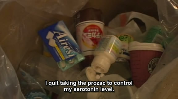 You can certainly interpret the film psychoanalytically. Very early on in the film, we see Masuoka discard a bottle of prozac right before descending into Tokyo’s underground tunnels. Right off the bat, we know that Masuoka has a history of mental illness. I’m not an expert on prozac or clinical depression, the condition that it is supposed to treat. Nevertheless, let’s speculate. Let’s say depression makes you inactive and lethargic. Might this explain Masuoka’s obsession with fear? To be accurate, Masuoka’s obsession started when he happened upon a man in the middle of committing suicide: “What did you see? When you poked your eye out in the subway tunnel, you looked as if you’d seen something most terrifying.”