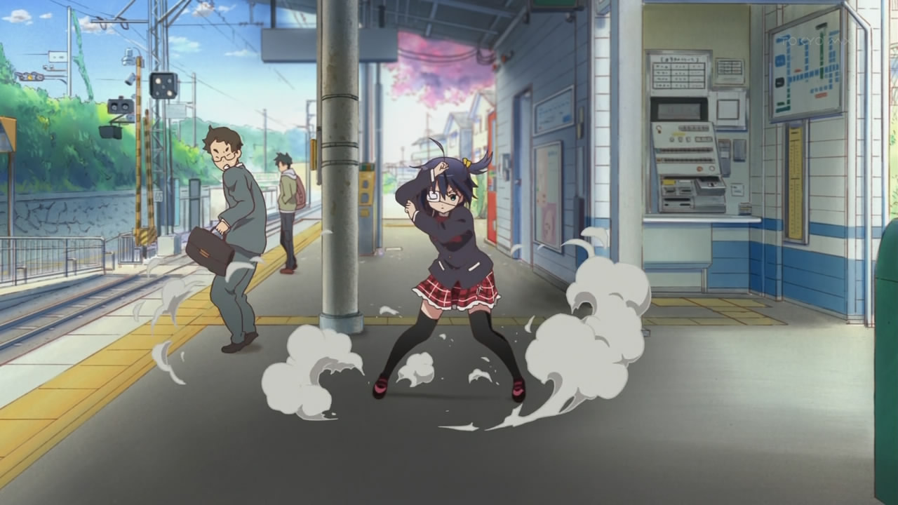 Not much else to say. Yeah, they’re really missing an opportunity if they don’t take the piss a little. I thought a lot of the childish delusion stuff was done pretty well though, like pretending she was opening the train doors herself, that felt pretty spot on to me. The whole concept of chunibyou seems to be taking the piss out of the audience of such shows, but it’s definitely not enough on its own.