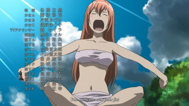 • A young girl finds herself marooned on an island by some guy named Samon. For those unfamiliar with The Tempest, it is a play about Prospero, a man who has been marooned on an island by his brother Antonio. Prospero was not alone, however, as he had his daughter Miranda with him. Anywho, the young girl in the anime claims to have magical powers. It just so happens that Prospero was also a magician. Whether or not there are any further parallels between the girl and Prospero remains to be seen. We do get a bit of irony, however, when the young girl cries, “At least he was nice enough to not leave me here in my underwear.” Sure, she has a dress and sandals on, but that dress may as well be negligee.