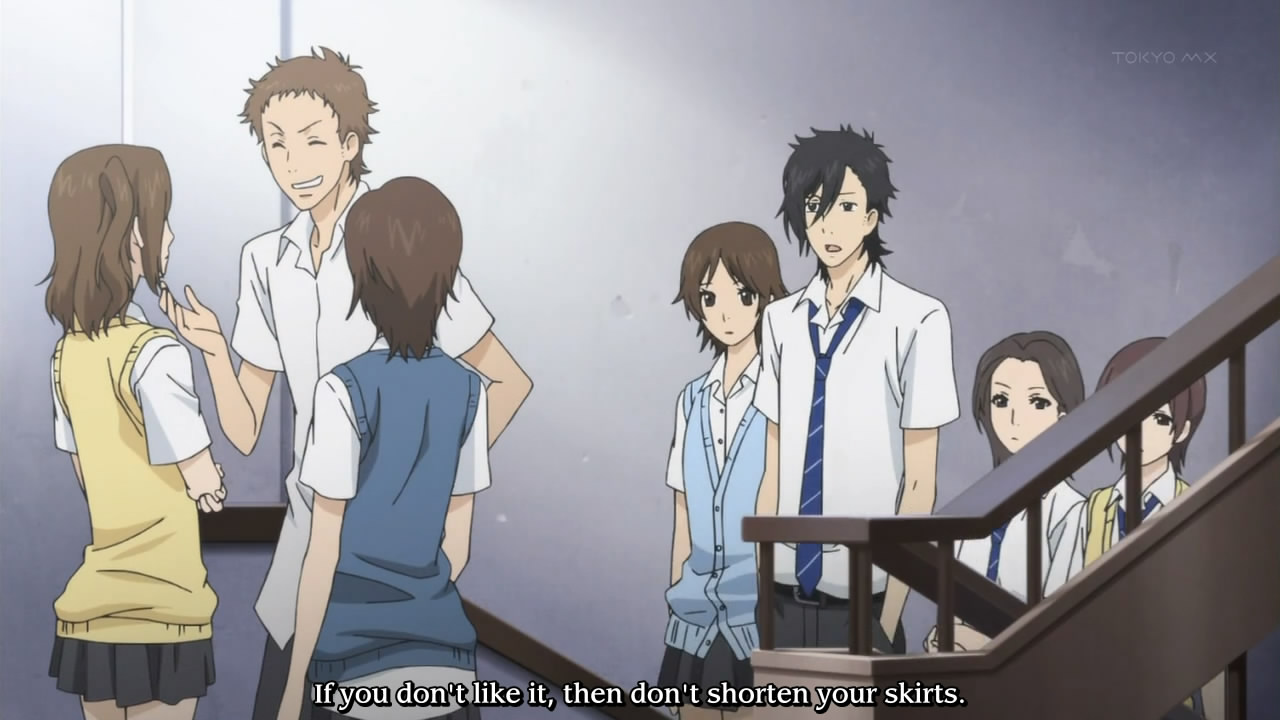 Even though this shoujo isn’t quite as hardcore as its sisters, an animal still had to die. Are you ladies out there so cold-hearted that only animal sacrifices will suffice?! Anyway, I was so awestruck by how this show managed to be so structurally similar to Tonari no Kaibutsu-kun that I couldn’t resist mocking both of them for it. Now, whether or not I’ll keep this up will depend on what the second episodes bring. But look on the bright side: between him and Monster-kun, Skrillex is coming out of this smelling pretty rosy! Who would’ve thought that? Obviously, his best friend can be a big enough creep for the both of them (see the screencap above).