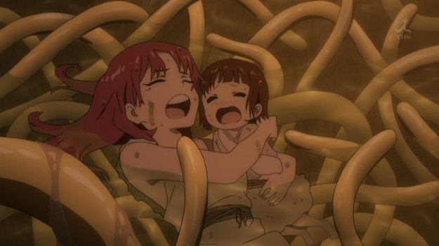 I think this show wants to poke fun at the fantasy genre, but the jokes fall woefully short. From time to time, Kon, our hero, tries to break the fourth wall as if to suggest, “Man, is this fantasy setting silly or what?” Unfortunately, none of his observations have any bite to them. Plus, who still thinks it’s funny anymore to accidentally grab a trap’s junk? And since we’re apparently so obsessed with dicks and balls, the hero literally saves the day by kicking the villain in the balls. Ixion Saga DT is already aggressively ugly — this must be the B-team from Brain’s Base — but it’s also just aggressively dumb. And yes, those are giant, 3-D letters assaulting my vision in the screencap above.