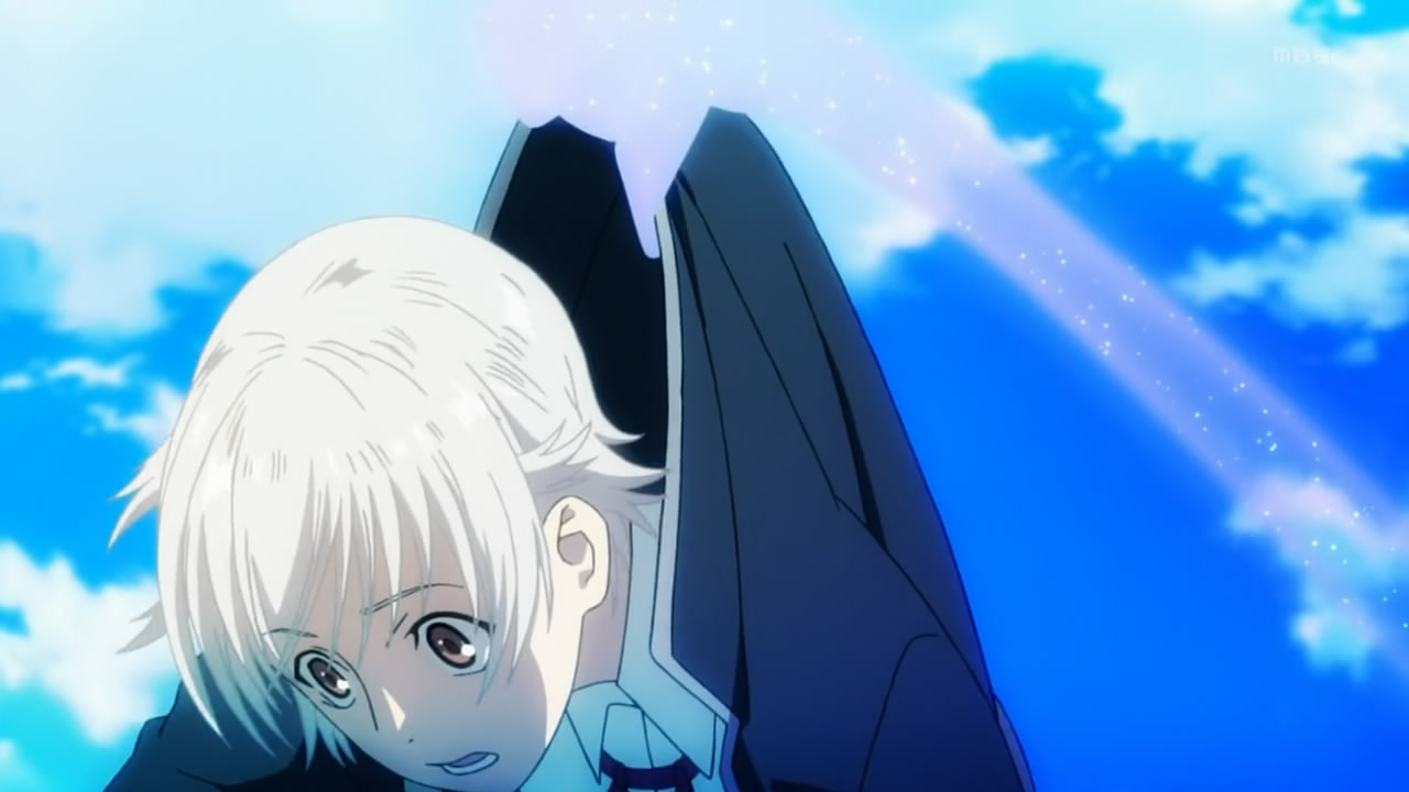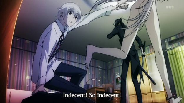 • Kuro finds his way to Shiro’s school, katana and all. For a giant school, it sure lacks any sort of security. No one seems remotely nonplussed by Kuro’s bizarre appearance or behavior though ’cause it’s anime.