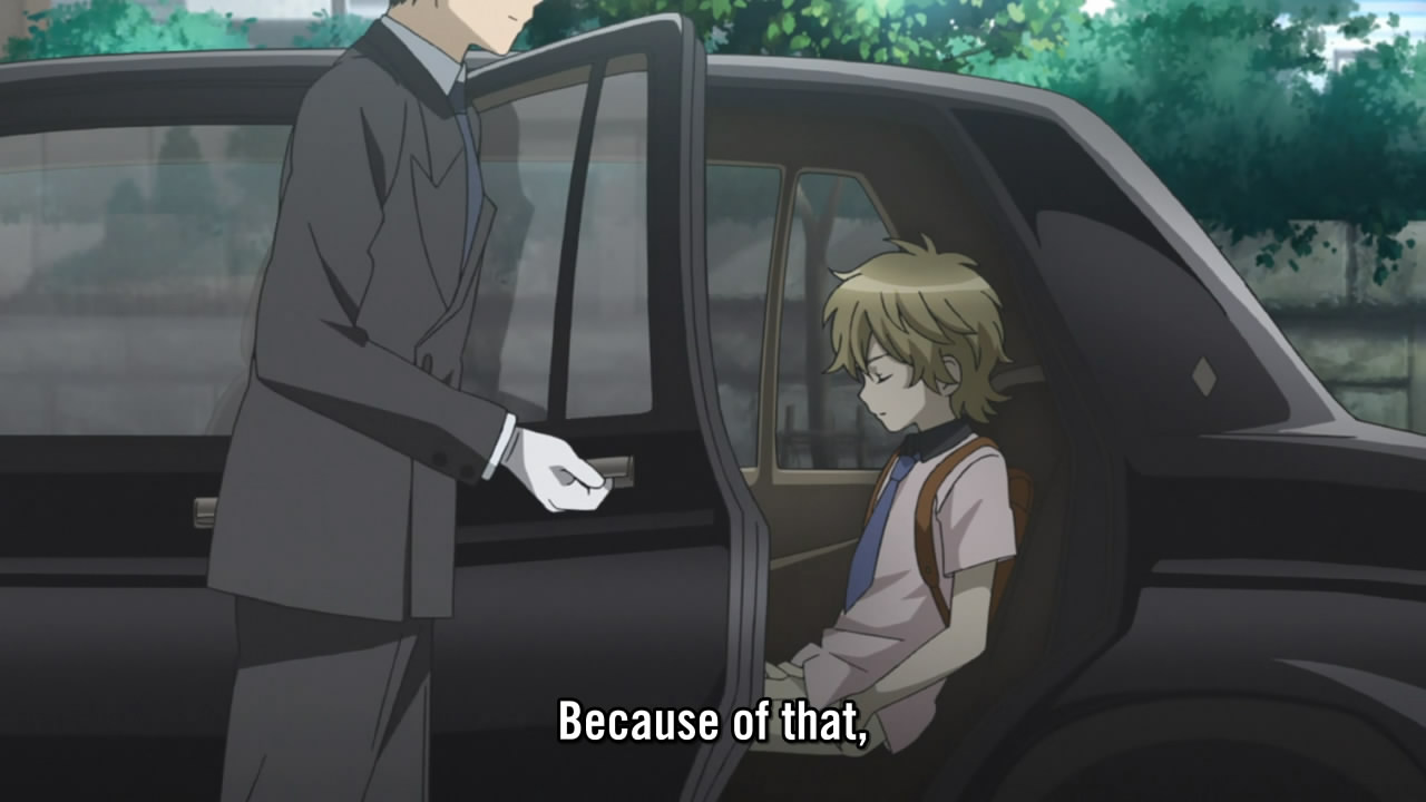 We see a younger Mahiro come to school in an expensive black car. A chauffeur even opens the door for him. As Mahiro makes his way to class, all of the other students stare at him nervously. It is obvious from these images then that Mahiro’s in a different social standing than the other kids. It is equally obvious from these images that Mahiro gets special treatment from everyone. So why, I ask, does Bones not just allow the visuals do the work it is meant to do? C’mon, anime is a visual medium. It is thus so unnecessary and boring for the characters to drone on incessantly instead of allowing for the subtleties of the visual narrative to come through.