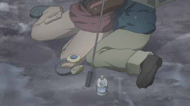 • In the end, Mahiro visits the two-kids-turned-statues and leaves behind a half-finished bottle of water. Like Yoshino leaving behind an umbrella, Mahiro is sort of venerating the dead. I know firsthand that Chinese culture will leave offerings of food behind to venerate the dead. If Japanese culture shares this particular custom, then I guess it doesn’t surprise me one bit. On another level, the scene is trying to convey the idea that Mahiro’s nicer than his outward nature might imply. Like the rest of the episode, however, there seems to be nothing more to the idea than just this.