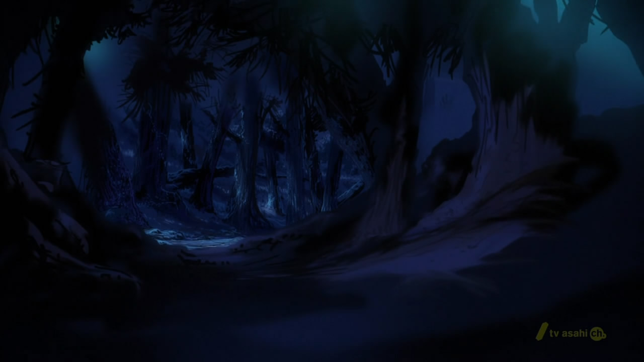 • The world has taken on a strange, new aesthetic. In the previous episodes, everything had seem so idyllic and/or pastoral. For instance, the forest was a familiar shade of green and peaceful-looking. In contrast, the fifth episode presents us with an alien-looking world with shades of red and purple… not unlike what we’ve seen from the parables in the earlier episodes: