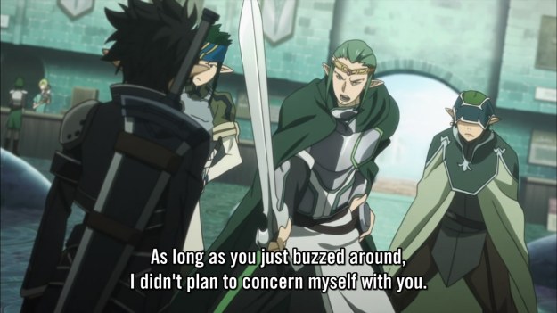 • Nothing you would ever hear coming out of Kirito’s mouth: “Maybe I’ll just let my friend handle her affairs. After all, it’s none of my business, she hasn’t asked for my help, and she looks like she’s capable of doing it herself.” Instead, he saunters forth coolly like a badass butts in and tells off Leafa’s party leader. And of course, now Sigurd wants to fight Kirito: