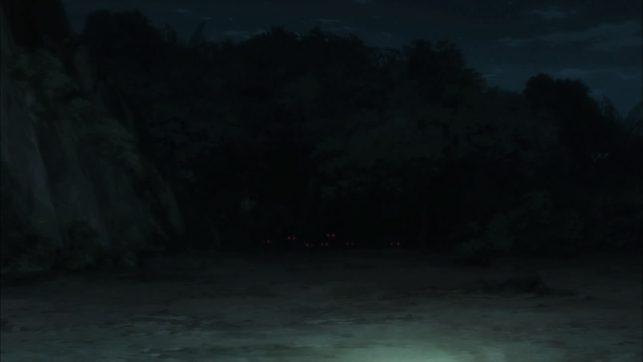 • These guys seem to lack common sense. Taira probably doesn’t have any disinfectant on hand, but it doesn’t even appear as though he’s tried to wash it in the stream. Plus, why hasn’t he torn out a piece of cloth and wrapped it up? Well, the anime tries to wave this off by saying that our heroes simply don’t have time to do so. Apparently, there are even more komodo dragons in the jungle, and they’ve been following our heroes (very slowly). I just like how we haven’t seen a single animal life form on the island up until the last minute of the previous episode, but now there seems to be an entire colony of komodo dragons just waiting to pounce.