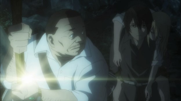 • Where did Ryuta get the bucket? If Himiko’s so distrustful of these guys, why hadn’t she left in the middle of the night or something? Where did Ryuta get that flask? Is it alcohol in the flask? C’mon anime, give us some details, man.