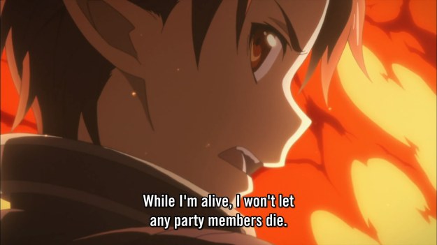 The thing that’s really dumb about the fight is that Kirito is supposed to be this MMO expert. Hell, you don’t even need to be an MMO expert to realize that the tanks will be up front, and the damage dealers/healers will be in the back. And yet, Kirito doesn’t even think about attacking his enemies in any other way.