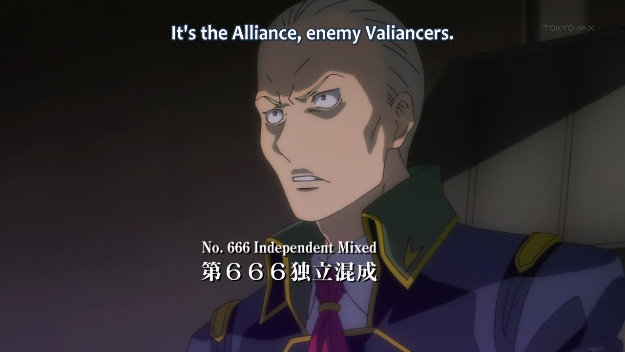 • The enemy commander is surprised to see the fancy Coupling Valiancers. I guess news don’t travel very fast amongst the Zogilia ranks. Also, you know the Zogilia guys are bad because only bad guys would comb their silver hair that way. Again, anime convention.