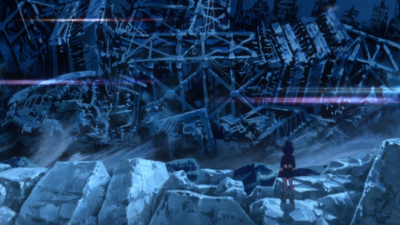 So again, why is the human toll missing? Is it possibly due to the fact that Ryuuko herself is unable to see the human toll? By this, I am suggesting that she can’t even conceptualize the idea of people losing their lives much less accept it. That up until now, everything has been rather game-like, i.e. Ryuuko defeating all her opponents in a progression as if they were video game bosses. As a result, she has blind spots. The reality hasn’t hit home. Yes, she can see the broken, toppled buildings and the upheaved concrete, but where are the bodies? The answer: they’re out there but we just can’t see them from our heroine’s perspective. She’s still just a child; she isn’t mentally prepared to accept the horrors of war. Unlike Gen, Ryuuko still has her innocence. As such, there’s resistance when the Real attempts to intrude upon her Symbolic Order: “‘I don’t give a crap about that!’ That’s what I really wanted to say.”