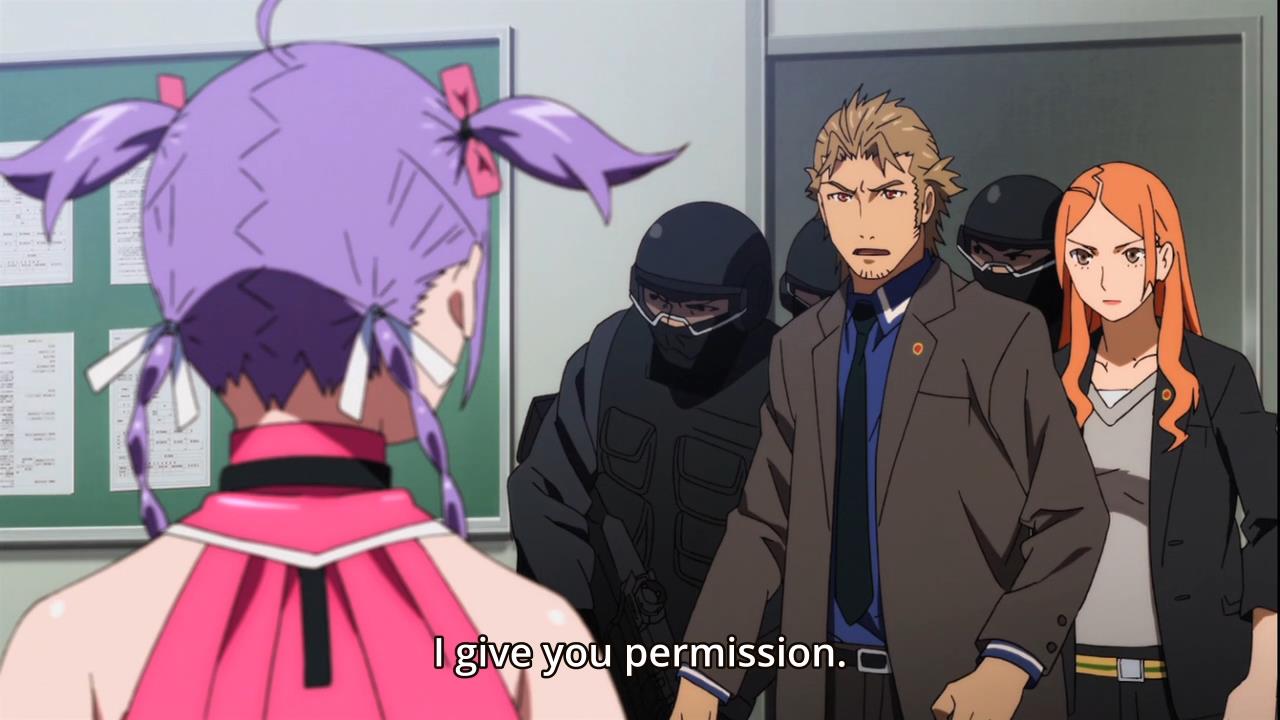 • Then the anime cuts back to Shizumu and Quinn, and they are both dead serious about the situation at hand. So all in all, a rather schizophrenic tone for the episode. I’m not laughing, but I’m also not exactly at the edge of my seat either since I know everything will be resolved by the end of the episode.