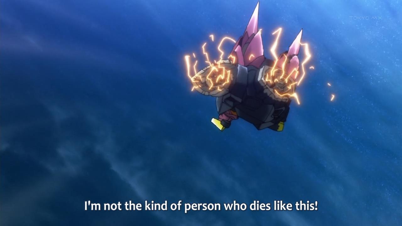 Like how is that even possible? We’re in the middle of the damn Pacific Ocean and, presumably, the Cygnus has been flying in a straight line for Hawaii ever since they rescued Aoba from that island in last week’s episode. So y’know, how is it that Zogilia keeps managing to catch up to the Cygnus, gets defeated easily, only to then catch up once again… just to be defeated once again? It’s like the Super Mario Kart of mecha warfare or something. The good guys always manage to get away, but the bad guys have a catch-up mechanic! But the best part is that it’s a surprise attack each and every single time.