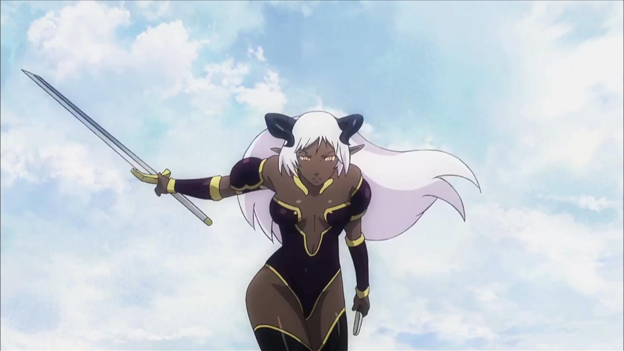So of course, it’s now Violet’s turn to match magical wits with Momoka. Why didn’t she just team up with the other three assailants to take Momoka down? Hey man, bad guys have honor too, y’know! They’d never fight an unfair fight! Anyway, Violet’s first move is to summon Valkyrie, which appears to be a dark-skinned girl with horns: